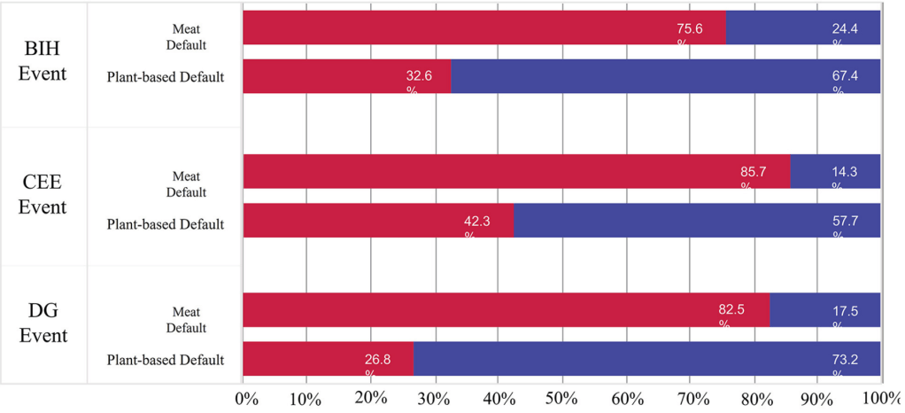 is key to reducing emissions and adverse planetary impacts. However, influencing dietary behavior to achieve planetary health targets remains a formidable problem. We investigated the effect of changing the default meal option at catered events–from meat to plant-based–on participants’ meal choices. Results demonstrated plant-based default menu options are effective, providing a low-effort, high-impact way to decrease consumption of animal products in catered events. These interventions can reduce planetary impact while maintaining participant choice.