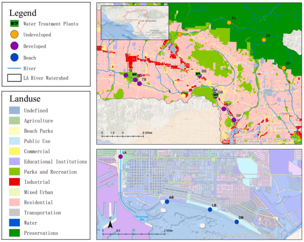 Urban land use and water reclamation plants can impact fecal indicator bacteria and antimicrobial resistance in coastal watersheds. However, there is a lack of studies exploring these effects on the US West Coast. In this study, sixteen locations were sampled in the Los Angeles River, encompassing both upstream and downstream of three WRPs discharging into